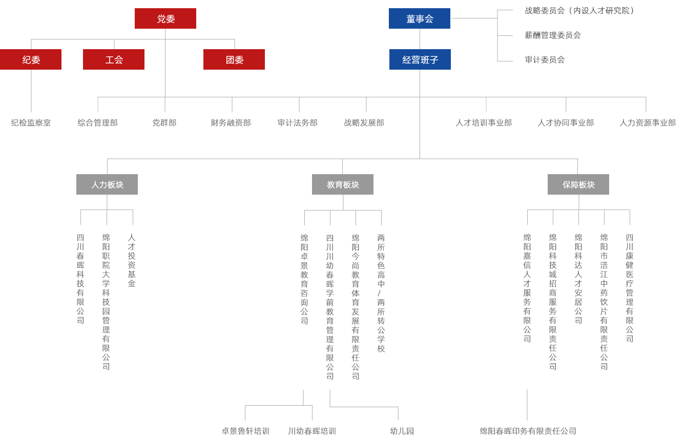 绵阳春晖教育管理有限公司(简称“川幼春晖”)是taiav (原“绵阳教投集团”)与四川幼儿师范高等专科学校战略合作,共同发起成立的集办学、科研、培训于一体,专业从事学前教育投资与管理的国有企业,注册资本5000万元,是人才集团全资子公司。业务板块主要涵盖:幼儿教育管理、幼儿教具教材研发、托儿所服务、单位后勤管理服务、教学设备租赁等。