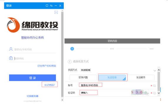 登录界面点击[忘记密码]-选择[短信找回]-输入手机号、验证码-新密码、短信验证码
