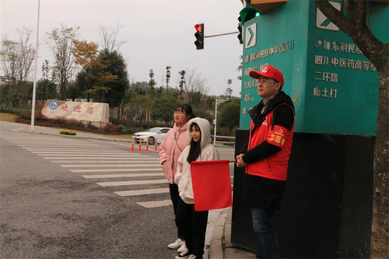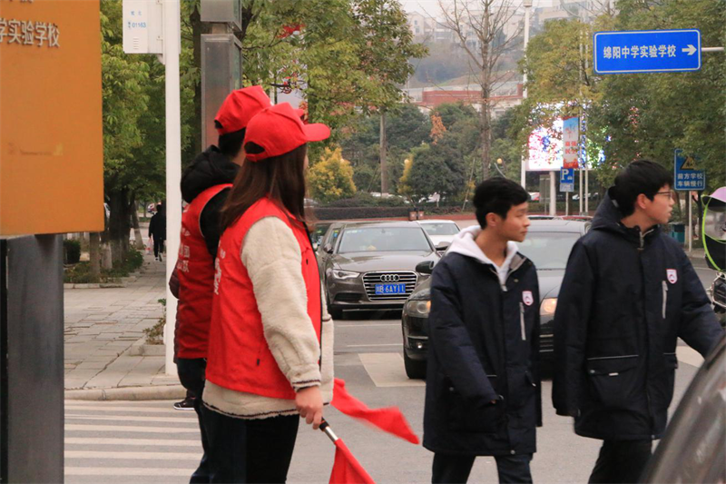 图为志愿者在绵阳外国语实验学校路口开展交通文明劝导