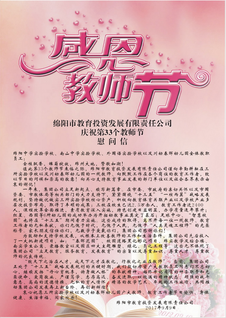 绵阳市教育投资发展有限责任公司庆祝第32个教师节慰问信