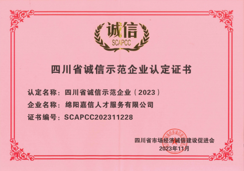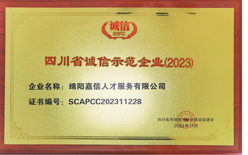 会上,嘉信人服凭借其良好的市场口碑,荣膺“四川省诚信示范企业”称号。这一荣誉的获得,无疑是对嘉信人服长期以来坚持诚信经营,积极履行社会责任的肯定和表彰。同时,也是对公司未来发展的鞭策和鼓励。嘉信人服将以此荣誉为契机,进一步发扬诚信经营的理念,提升服务质量,履行社会责任,为市场和客户创造更多价值。