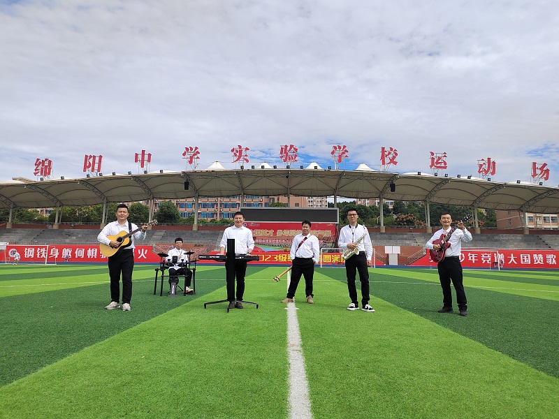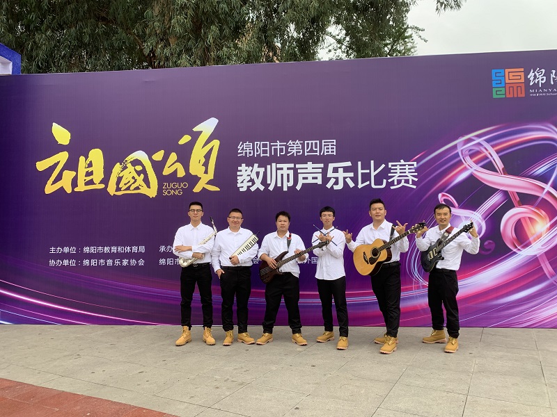 绵阳中学实验学校律动星空教师乐队由文果老师、张仲禹老师、王伟帅老师、高飞老师、龚冠雪老师、廖彦翔(高一新生)组成。比赛一共演唱了两首歌曲《启程》和《飞向梦想》,为了提高歌曲的难度,展现我们的专业水准,文果老师对两首歌曲进行全面改编。突出组合的音色融合性和声音的多声部性,将歌曲《启程》改为五声部的人声,多种乐器展示,人声完美融合。开场的纯人声四部合唱非常吸引观众,强弱对比明显,受到现场选手跟评委的一致好评,最终以复赛第一名的成绩进入决赛。决赛演唱的原创歌曲《飞向梦想》是由翟勇校长亲自修定歌词,文果老师编曲,展现出了绵实人勇于开拓、乐观向上、有教无类的精神风貌。决赛异常激烈,节目新颖,音乐表现形式多样,演出类型丰富,声音特点突出。绵阳中学实验学校乐队压轴出场,顾芗老师总协调,姚冬芝、徐小岚老师后勤服务,大家整体协作,团结就是力量。经过激烈的角逐,最终凭借专业的演出控场经验,强大的现场带动作用获得全市一等奖的好成绩!