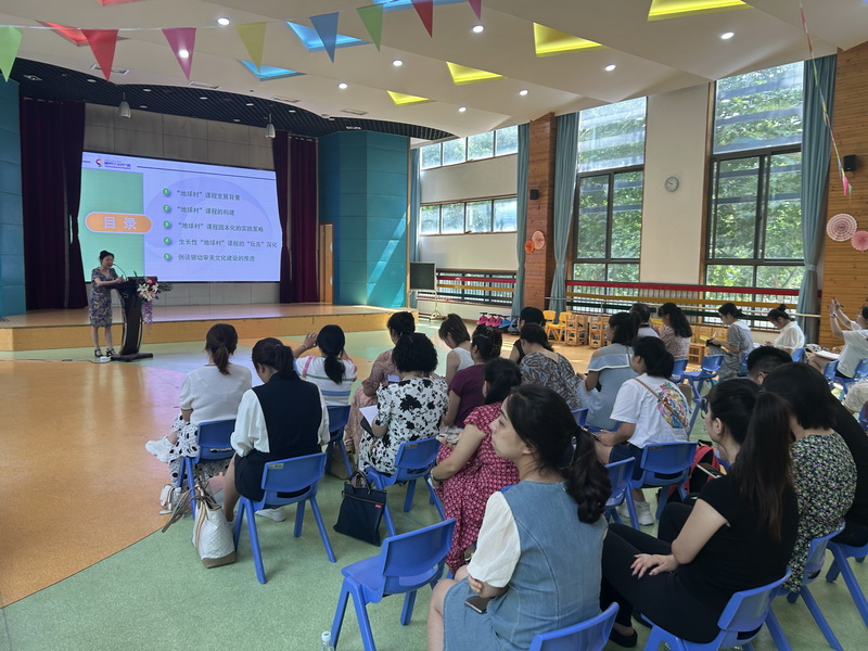 在南京市长江路小学附属银城双语幼儿园,文化性、情景性、开放性的室内外环境给学员们留下了深刻的印象。随后巫蓉园长为大家介绍了该园“地球村”课程的发展背景、构建历程以及园本化的实践策略,并通过分享教学案例,让老师们对“审美”到“玩美”有了进一步了解。