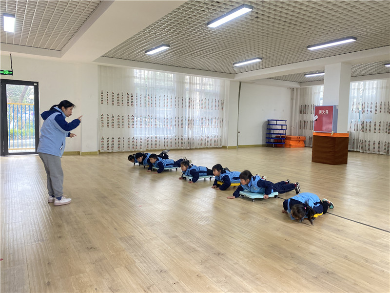 看,活动厅内小朋友们穿上鞋盒改装的“冰刀”,参赛短道速滑,背着手,弯着腰,还真有运动员的模样;冰壶赛场上,二人成组,一名队员掷壶时,另一名队员手持刷子在冰壶滑行的前方左右擦刷地面,哇撒!冰壶准确到达营垒的中心!在一片加油助威声中,钢架雪车比赛又开始啦!钢架雪车又名卧式雪橇、俯式雪橇,是在传统雪车基础上衍生出来的一项运动。现场,孩子们俯卧在钢架雪车上,以腹部为中心,身体紧贴钢架雪车,以双手慢慢往前爬行带动钢架雪车和整个身体前行。“我看电视节目上他们滑得挺简单的,怎么我滑起来这么难啊”大班的吴彦祾钊小朋友对记者说。