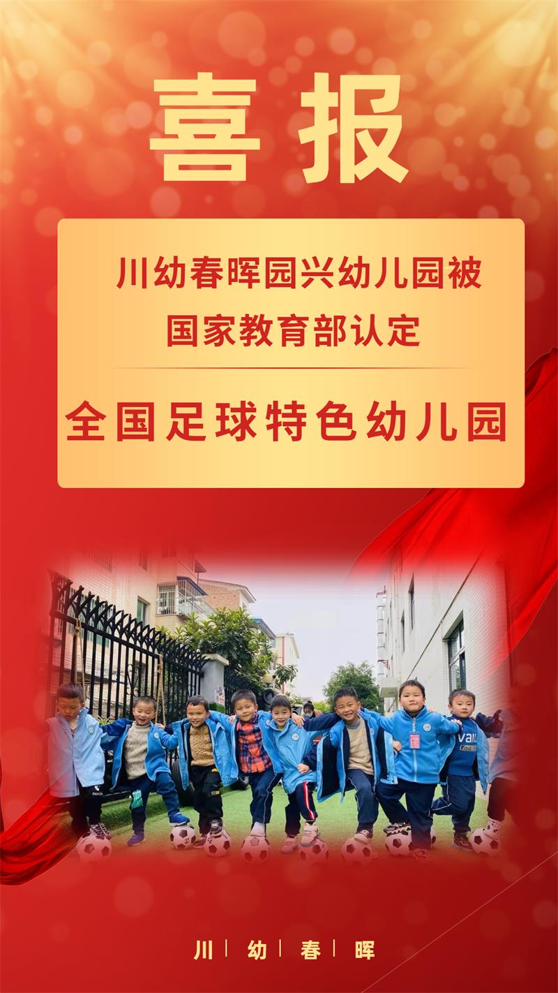 为增强旗下幼儿园幼儿体能素质,激发幼儿对足球的探究兴趣,根据《全国校园足球特色学校基本标准(试行)》要求,川幼春晖园兴幼儿园结合实际情况,稳步推进足球特色园的创建,积极开展足球特色系列活动,现被国家教育部认定为“全国足球特色幼儿园”。