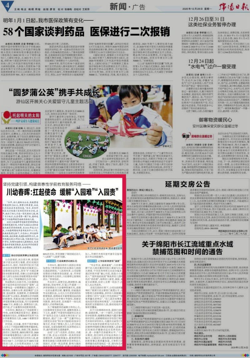 12月28日,《绵阳日报》第4版以《坚持党建引领,构建普惠性学前教育服务网络——川幼春晖:扛起使命缓解“入园难”“入园贵”》为题,报道了川幼春晖的国企担当。全文如下: