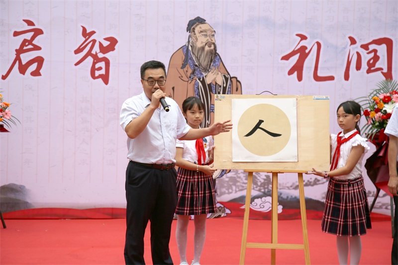 随后进行的朱砂启智、击鼓明志和书写“人”字活动,让学生体会到了满满的仪式感。石勇校长携学校领导、老师和家长代表为孩子们点朱砂、启智慧。党委副书记罗萍和小学部主任何智芬带领一年级的小朋友三击鼓,鼓声铿锵。小学德育办李斌主任现场书写“人”字,唐俊峰副校长结合“人”字为孩子们作了生动的入学启蒙教育。