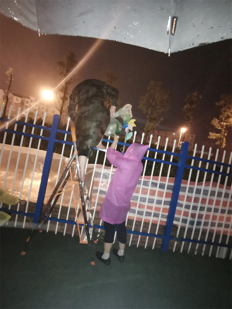 近期,绵阳持续暴雨,8月15日晚7:00—8:00时间段,红星幼儿园周围发生了不同程度的积水。为了预防造成幼儿园财产损失,川幼春晖红星幼儿园郭园长在了解相关情况后,立即启动防汛抗洪应急预案,召集在绵教职员工到园进行抗洪抢险。