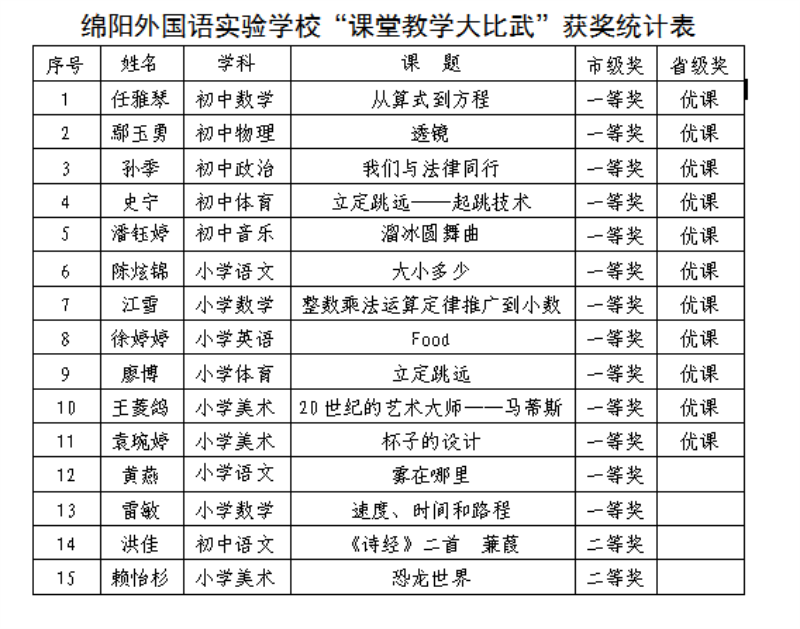 由省教厅、市教体局主办的2019年秋“课堂教学大比武”活动评奖近日揭晓。绵阳外国语实验学校喜获大奖:陈炫锦、鄢玉勇等11位老师的录像课例被评为省级“优课”,黄燕、潘钰婷等13位老师的录像课例荣获市级一等奖(最高奖),洪佳、赖怡杉2位老师的录像课例荣获市级二等奖。学校获得省级“优课”及市级一等奖的课例数均高居全市第一。在绵阳市教育和体育局官网公布的获奖名单中,学校初中数学、初中物理、初中道德与法制、初中音乐、小学美术、小学体育等6个学科位列全市同学科第一名。