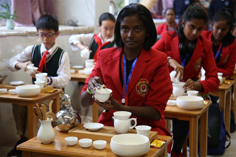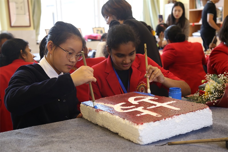 参观完毕后,斯里兰卡总统女子学校师生代表团一行还走进教室,体验了富有中国传统文化特色的书法课和茶艺课。国际友人们对传统文化课程有着浓厚的兴趣,她们有模有样地拿起毛笔涂色拓印,感叹汉字的神奇,饶有兴致地拿起茶具品尝中国茶、体验中国茶艺文化。