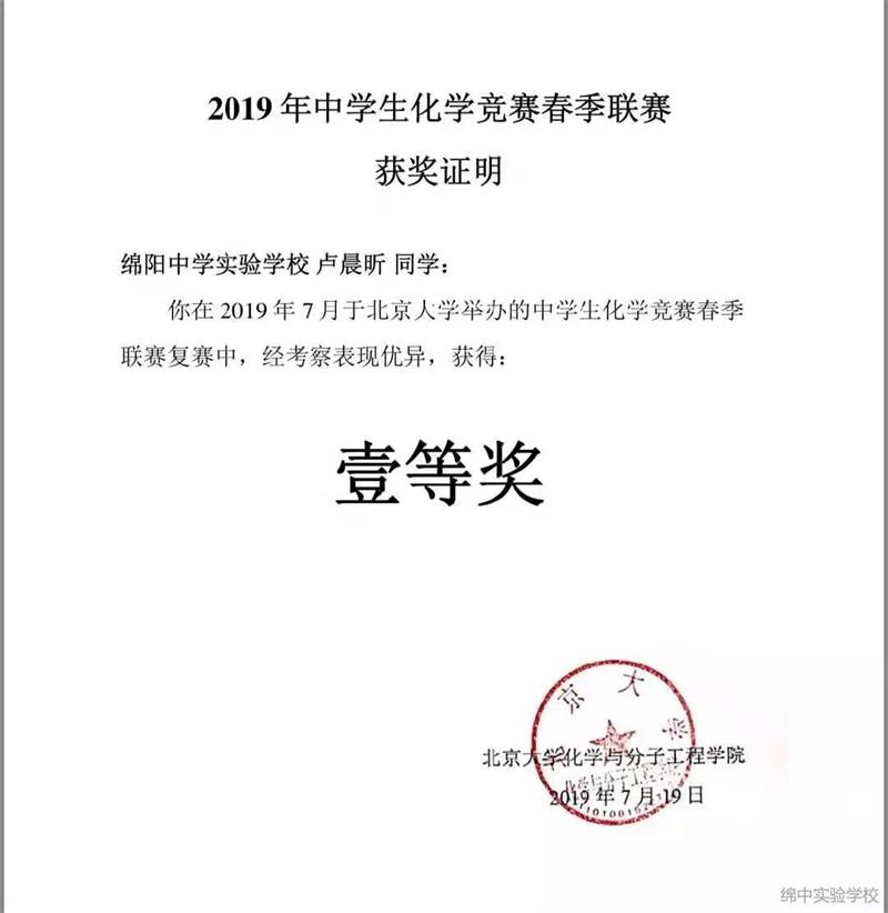 在第33届中国化学奥林匹克(初赛)中,绵阳中学实验学校高2017级3名同学获得全国一等奖,获奖人数在全市名列前茅。其中,卢晨昕同学还在今年7月北京大学举办的中学生化学竞赛春季联赛复赛中,表现优异,获得一等奖(全国仅有129人获得一等奖)。