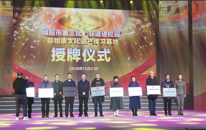 12月21日下午,由中共绵阳市委宣传部、绵阳市文化广电新闻出版局、绵阳市教育和体育局主办,绵阳市非物质文化遗产保护中心承办的“璀璨非遗﹒薪火相传——2018年绵阳市非遗进校园成果展演”在绵州大剧院隆重举行。绵阳外国语实验学校荣获“绵阳市第三批非物质文化遗产传习基地”。