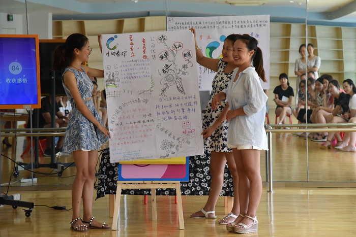 培训中,教师以“自由交流”“名字接龙”“用一句话介绍自己”的方式让员工们充分展现自我、互相认识;在“你眼里的川幼春晖”环节中,大家以头脑风暴的方式共同协作描绘出对公司的独特理解;接下来通过故事、案例、视频分享了如何构建归零心态、积极心态、感恩心态等六种阳光心态。在整个活动过程中,员工们都表现得大方得体、自信飞扬,现场气氛十分活跃。25日-26日主要是分岗培训,教师采用幽默风趣的游戏形式、鲜活的案例分析和个性化指导等方式,向员工们深入浅出的讲解了如何更加有效的开展班级管理、保教工作、环境创设、家长引领、安全预防等工作。培训最后,给新员工布置了假期作业:一是学习《3—6岁儿童学习与发展指南》,二是拟定自己的职业发展规划。