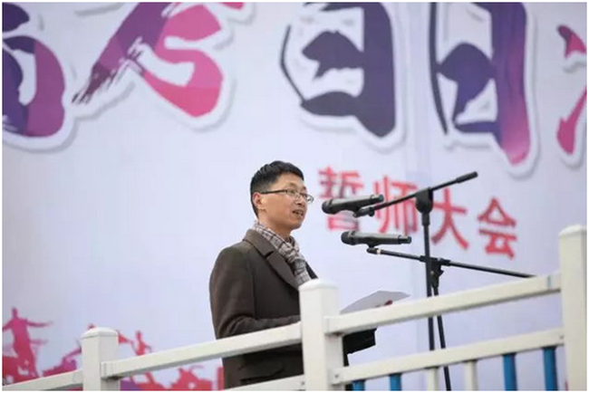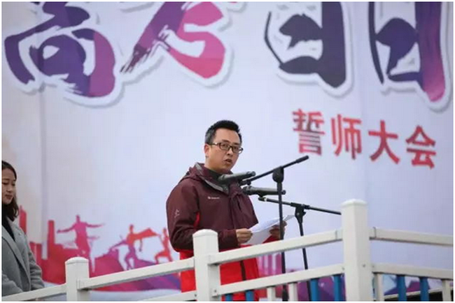 补习年级历史组刘刚老师作为教师代表发言,刘老师肯定了同学们过去的辛勤付出和可喜成绩,以感动中国人物洪战辉和往届学生的真实故事鼓舞同学们,不忘初心、不懈追求。刘老师说,在南实,所有老师会与同学们一道攻克难关、拼尽全力,誓取成功。