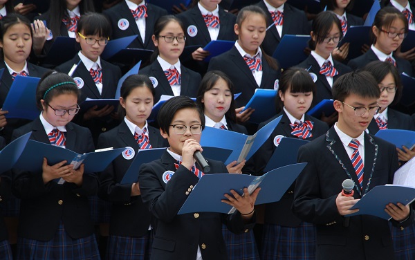 慷慨激昂的国歌和蒋校长的精彩致辞,拉开了今天下午朗诵活动的序幕。高一语文组18位老师的集体朗诵,铿锵有力,诗歌飞扬,表达着对经典文学的向往和追求;8名小朋友的稚嫩童声,传达出《三字经·孝悌篇》中的文化内涵,鹏程广场,大德无疆!