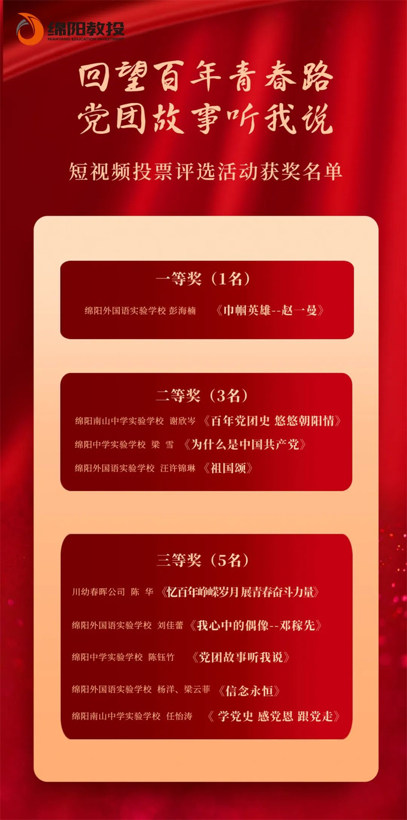 讲述一段党团故事。6月至7月,集团组织开展“回望百年青春路·党团故事听我说”短视频投票评选活动,组织三所实验学校、川幼春晖所属幼儿园青年党员、团员、少先队员讲述百年党史、团史的重大事件及红色故事,并制作成短视频作品在集团微信公众号进行专题推广展示和投票评选,按点赞排名情况进行评奖。掀起了集团各级党组织、团组织学百年党史团史,讲好党团故事的热潮。