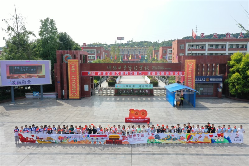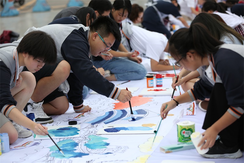 当天上午8时许,师生们早早来到绵阳中学实验学校门口,忙碌地做准备:铺画布、分绘画区域、分颜料、分调色板、画笔……看,孩子们神情专注,或坐、或俯、或卧,在老师的指导下,有的用马克笔勾勒造型,有的用排笔创意添彩,有的用水粉笔细致描绘,从画面的构思到色彩的搭配,每个细节都一丝不苟。师生们用手中的画笔尽情表达对中国共产党、对祖国的赞美。