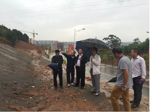2015年5月20日下午,绵阳市气象局发布绵阳市强降雨天气预报,教投公司董事长陈建强立即安排部署启动《园区汛期安全应急预案》并要求立即通知园区各学校单位切实做好安全防范巡查工作。昨夜暴雨后,21日上午9:00,陈建强董事长亲自带队,副总经理蒲昌文及工程项目部及在建项目施工单位、监理单位等相关人员一行,深入园区对道路已建和在建基础设施、南山中学实验学校校区、电大、水电校、民族中学、幼专等校周边的排洪、排污及山体边坡等部位进行了现场巡查。巡查结束后陈建强董事长作出如下要求: