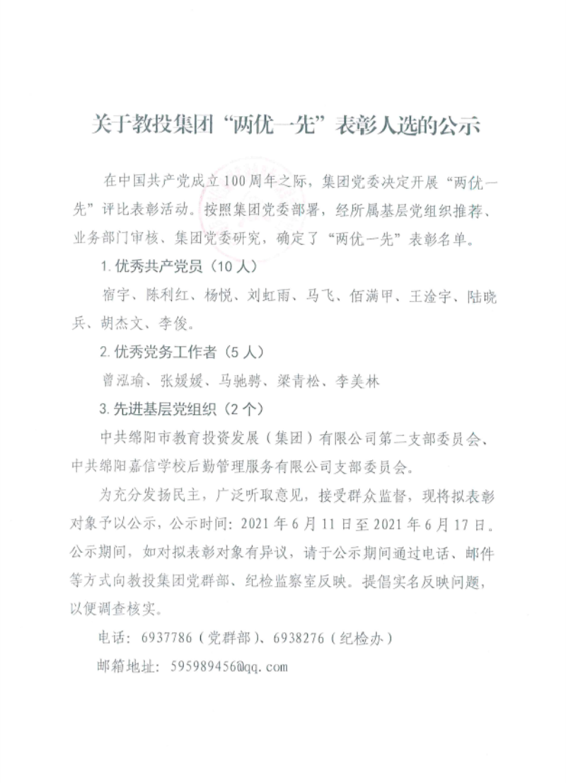关于教投集团2022年度“两优一先”评选 结果的公示