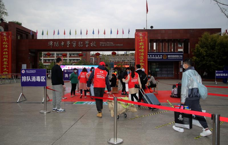 为防止大量人员聚集,严禁家长进入校园,按照事先安排,本次志愿服务分组分校进行,主要服务内容为开展教育园区文明交通疏导、人员比较密集处文明疏散及帮助学生提取个人行李等。从1日上午8时开始,在高三年级第一个学生入学报到前,志愿者们已配合社区民警、学校保安分布在园区各点位。在学校统一入口,每校设置了A、B两个通道入口,用警戒线拉出了男生通道、女生通道、行李搬运组、行李中转站、消杀组等小块区域,地面上,保持安全距离的红色一米线清晰醒目,志愿者们组织学生排队间隔一米排队陆续测体温、消毒入校。志愿者们帮助返校学生将行李统一运送到了校内特设的防疫爱心中转站,再由校内志愿服务队员搬运至寝室。