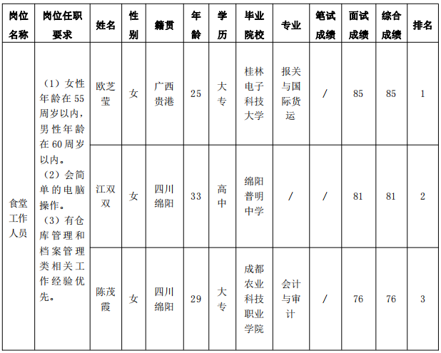 绵阳中学实验学校关于招聘食堂工作人员测试成绩的公示