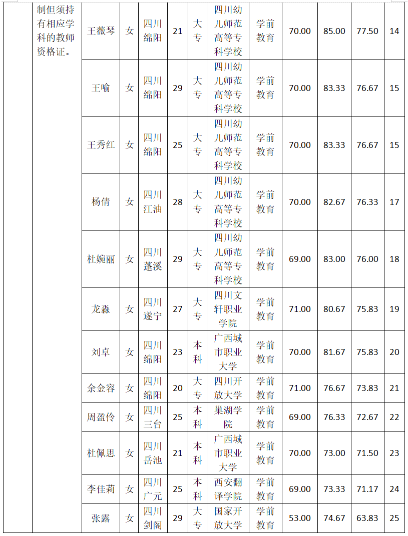 绵阳春晖教育管理有限公司关于招聘教师岗位测试成绩的公示(第三批)