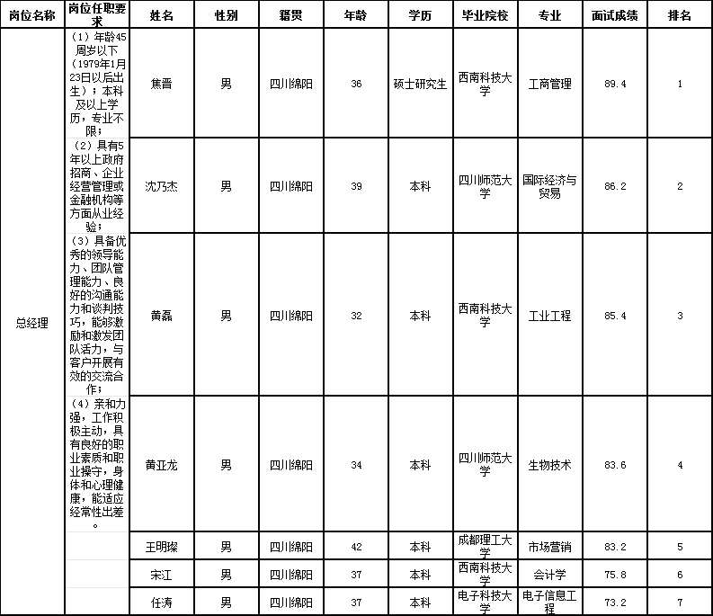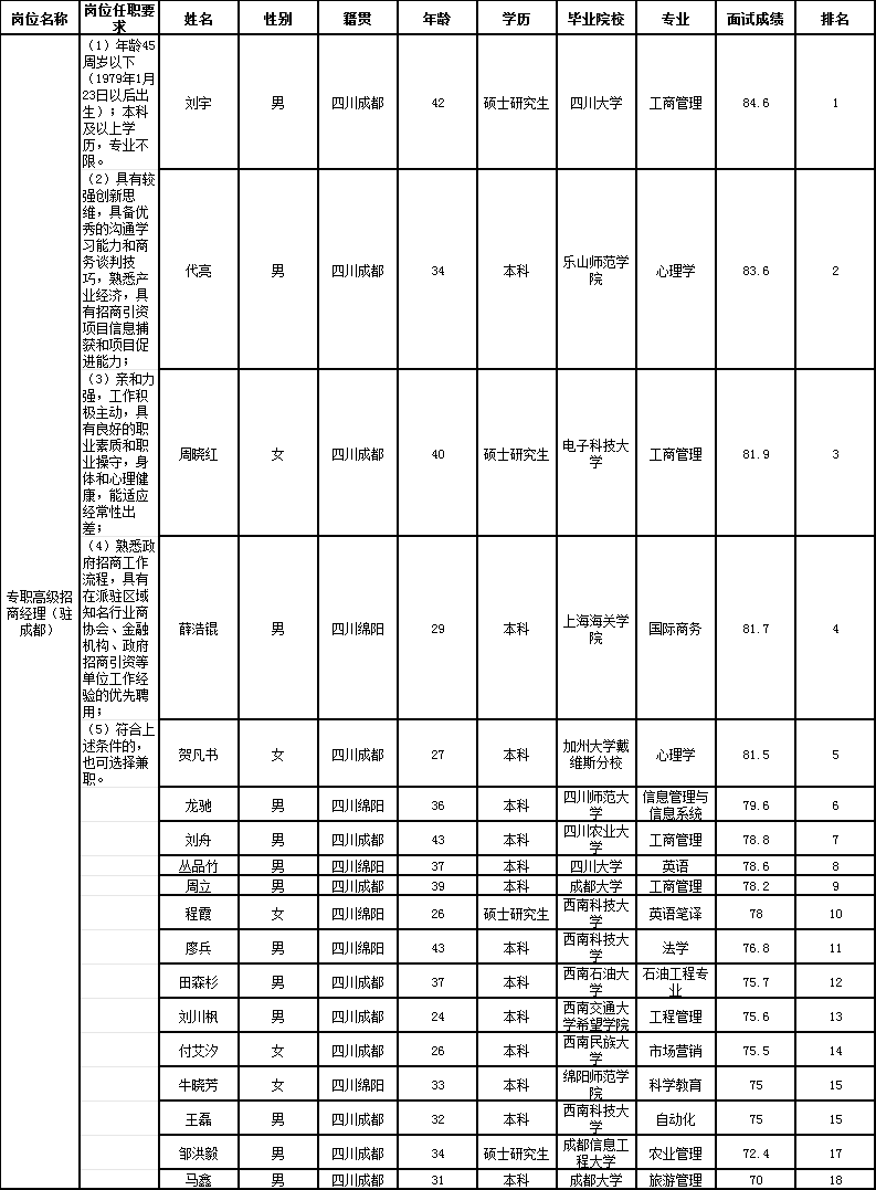 发布的公告及相关规定,经能力测试(能力测试不计入综合成绩排名)、面试等程序,现将总经理及专职高级招商经理(驻成都)岗位人员成绩予以公示。