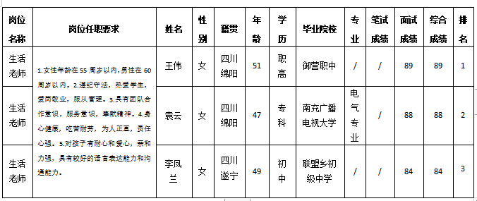 绵阳中学实验学校关于招聘生活老师岗位考核成绩及排名的公示