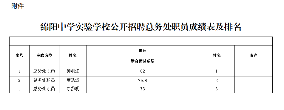 附件:绵阳中学实验学校公开招聘总务处职员成绩表及排名公示
