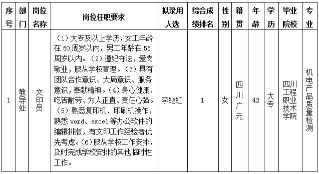 绵阳中学实验学校关于招聘文印员岗位拟录用人员的公示