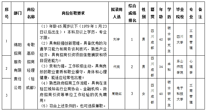 taiav关于绵阳招商服务有限责任公司专职高级招商经理(驻成都)岗位招聘的拟录用公示