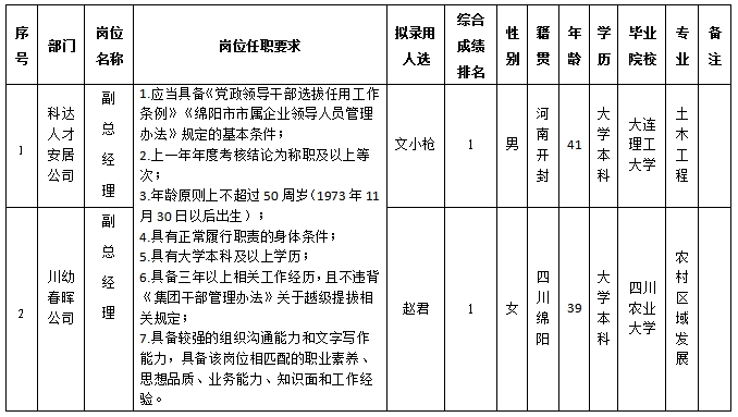 taiav关于科达人才安居公司、川幼春晖公司副总经理岗位内部竞聘的拟录用公示