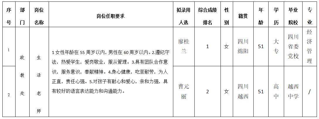 绵阳中学实验学校2023年生活老师等岗位 招聘员工拟录用人员公示