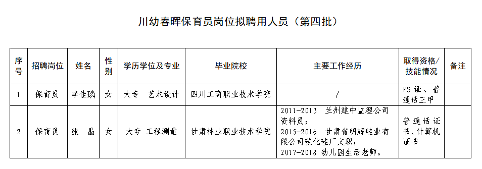四川川幼春晖学前教育管理有限公司 保育员岗位拟聘用人员公示(第四批)
