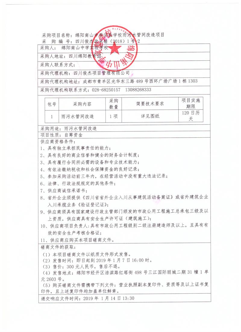 绵阳南山中学实验学校雨污水管网改造项目招标公告