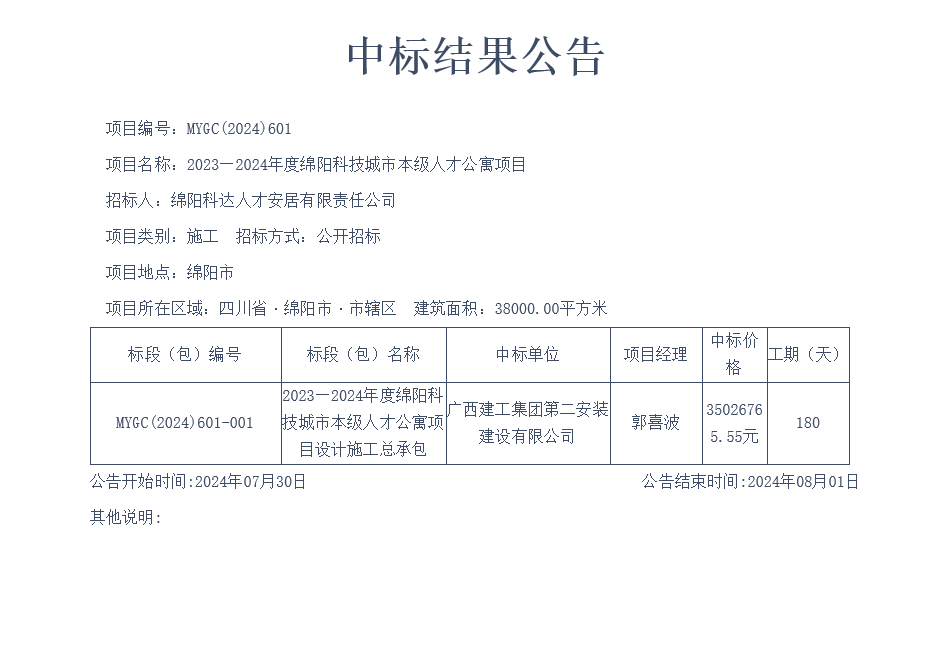 2023-2024年度绵阳科技城市本级人才公寓项目中标结果公告