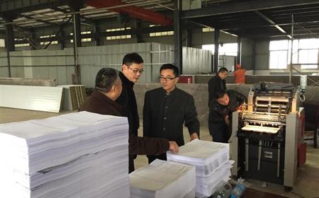 绵阳春晖印务公司是绵阳教投公司子公司,初期投资300多万元。自2015年11月上旬启动建设以来,厂房改建工作正在有序加快进行,10台价值近200万元的生产设备已全部运至现场。根据业务工作进展需要,公司克服困难,一边进行厂房改建,一边进行小批量杂件印刷生产。教投公司董事长陈建强、总经理廖昭宏、副总兼春晖印务执行董事蒲昌文正在现场视察。切纸机进行运行