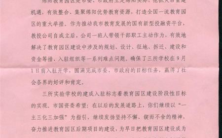 九月十六日,绵阳市国有资产监督管理委员会发出贺信,祝贺教投三所实验学校全面顺利入驻。